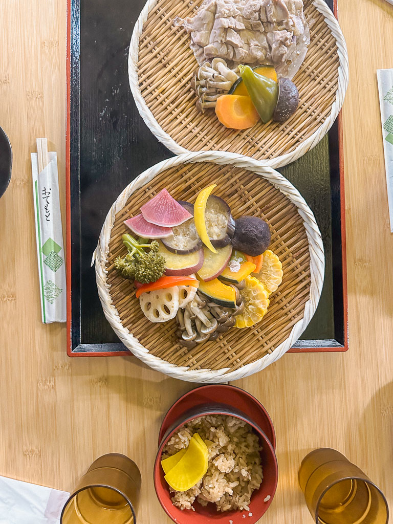 - Jigoku Mushi: Gemüse und Fleisch, das in natürlichen heißen Quellen gedämpft und mit Soßen zum Dippen serviert wird.