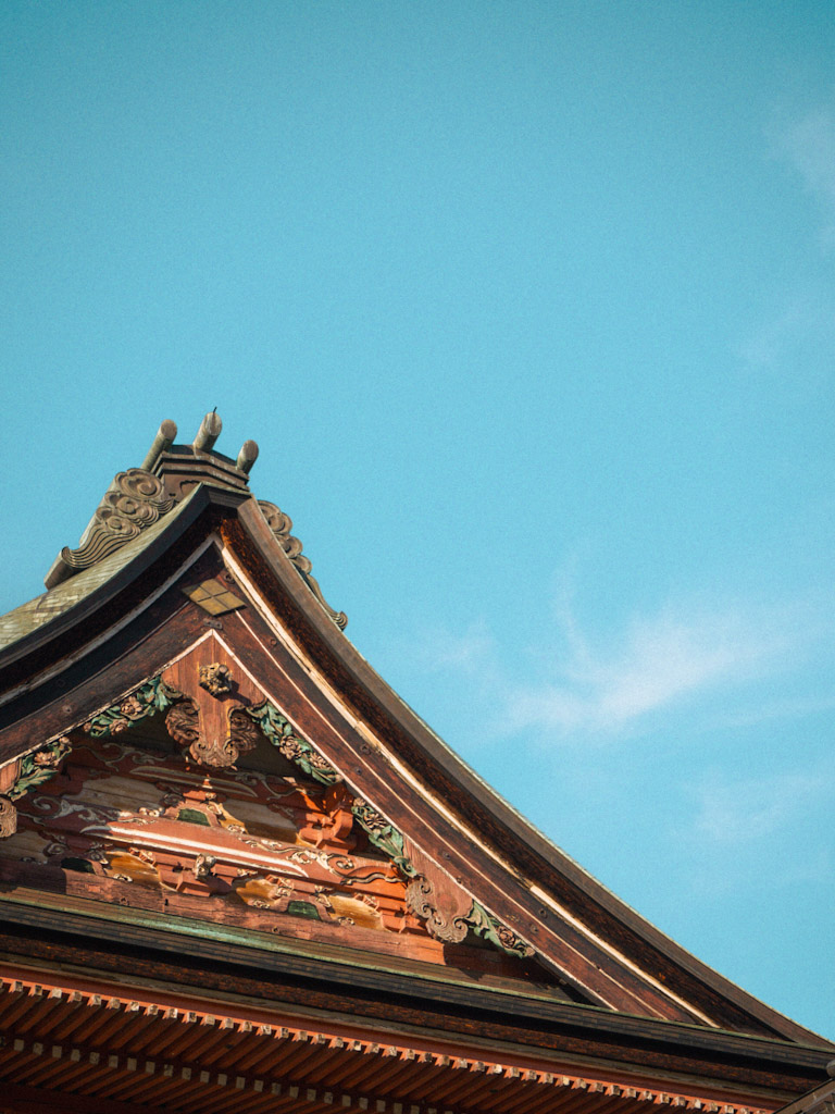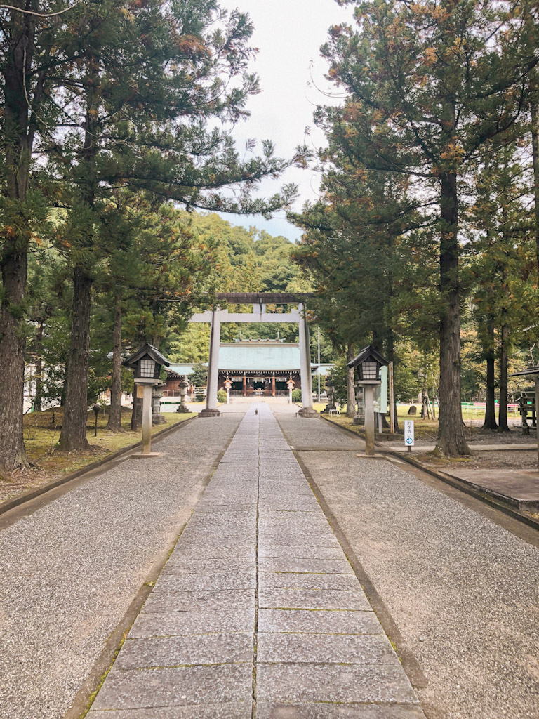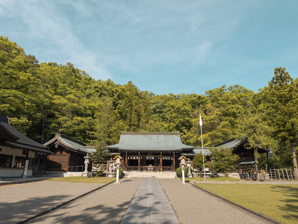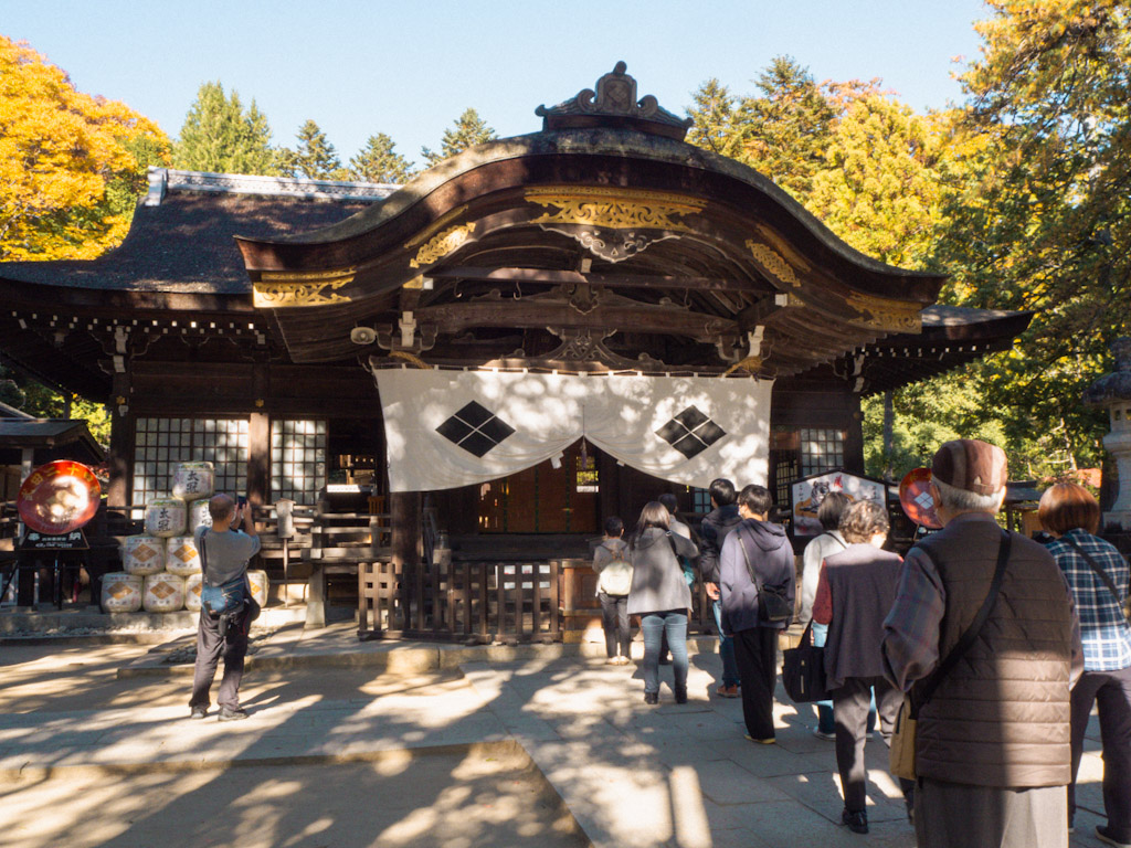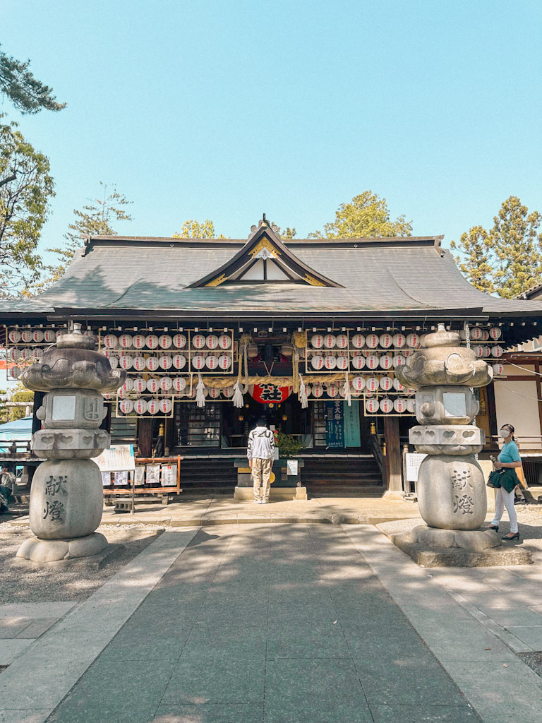 Auf dem Grundstück des Schreines kannst du immer noch die ursprünglichen Gräben und Steinmauern der damaligen befestigten Residenz der Familie sehen. Ansonsten besteht der Schrein aus einer Haupthalle, wo du Talismane oder Orakel kaufen kannst, einer Gebetshalle und einer wunderschönen Noh-Bühne.