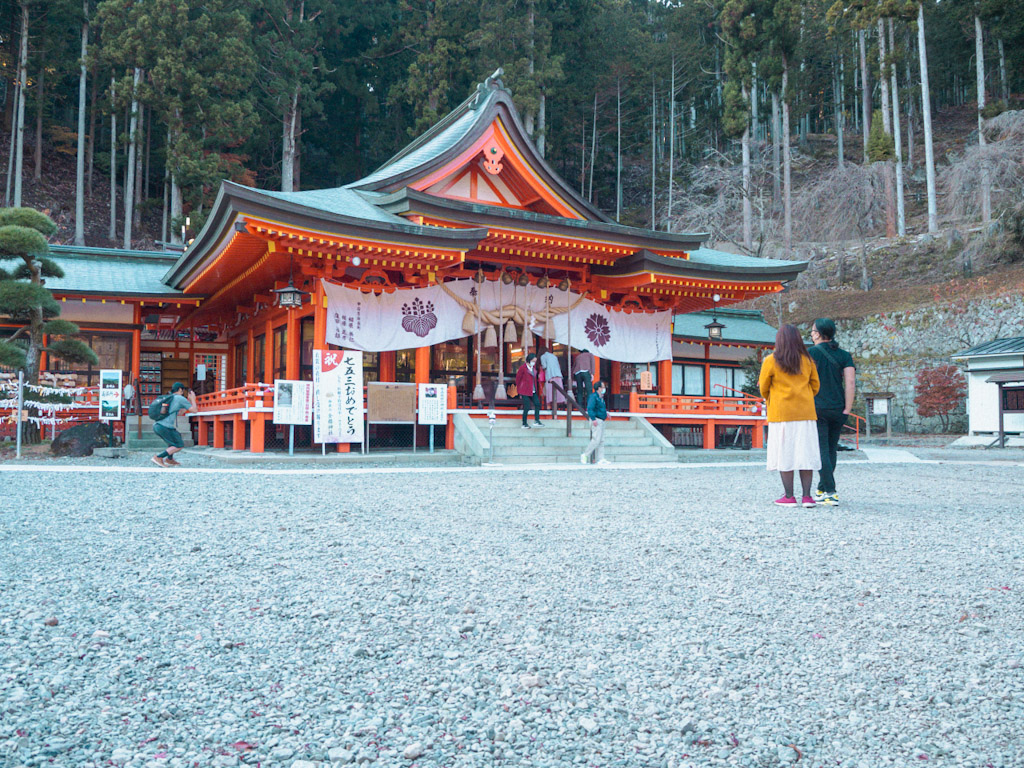 Etwas oberhalb des Shosenkyo-Wanderweges befindet sich der Kanazakura-Schrein, der im Frühling von hunderten von Kirschbäumen umgeben ist. Da der Schrein auf einer kleinen Anhöhe ist, musst du zuerst die Steintreppen hochgehen und die Säulen, die wie aufsteigende und absteigende Drachen aussehen, passieren.