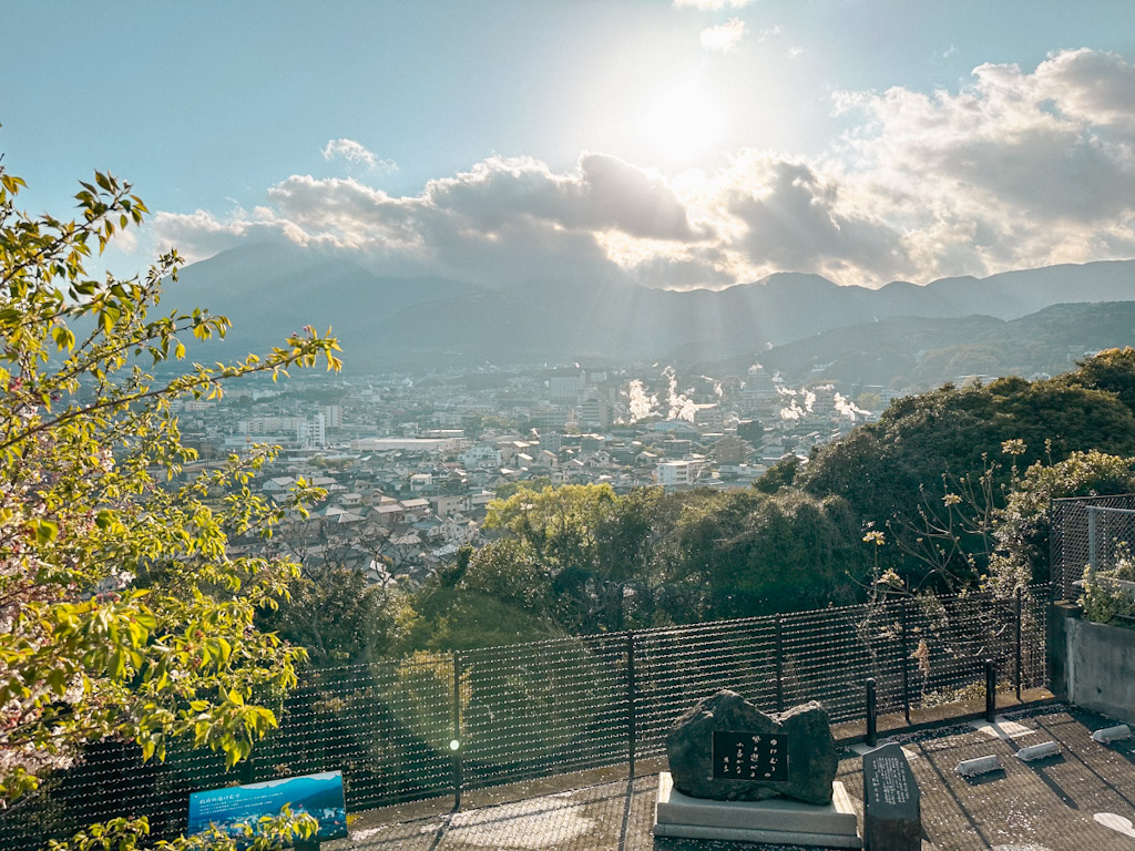 Auf dem Weg zurück zum Kannawa-Viertel kommst du auch wahrscheinlich an das Yukemuri-Observationsdeck vorbei. Dort hast du nochmal einen fantastischen Blick auf die Stadt und die dampfenden Onsen.