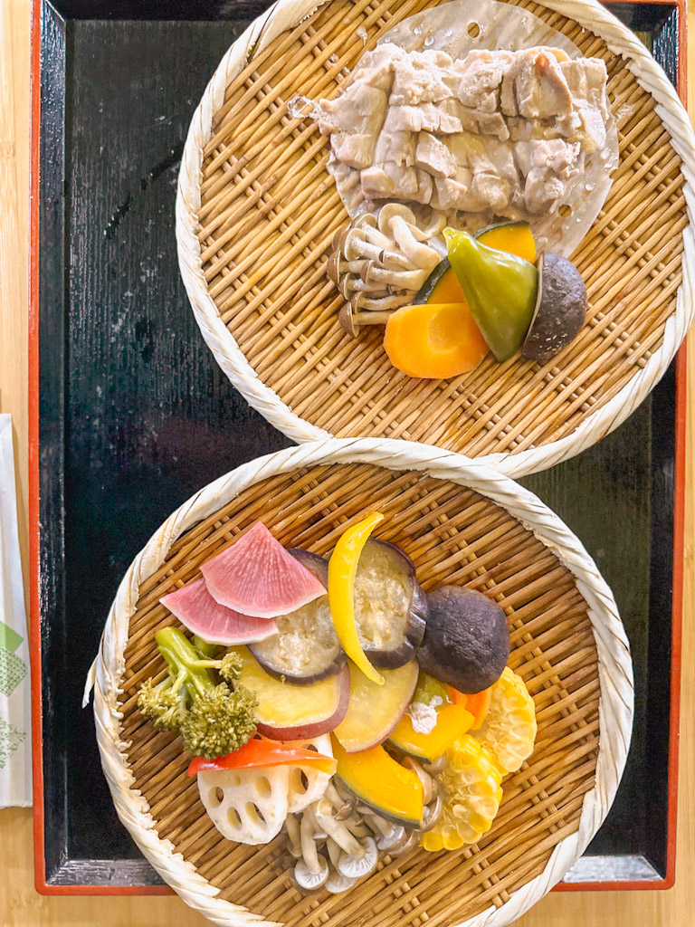 Ich habe in jedem Becken des Hyotan Onsen ca. 10 bis 15 Minuten verbracht und danach noch im Restaurant das berühmte Gericht „Jigoku Mushi“ gegessen. Bei dem Gericht werden die Zutaten in dem natürlichen heißen Dampf der Onsen gegart und anschließend mit Soßen zum Dippen serviert.