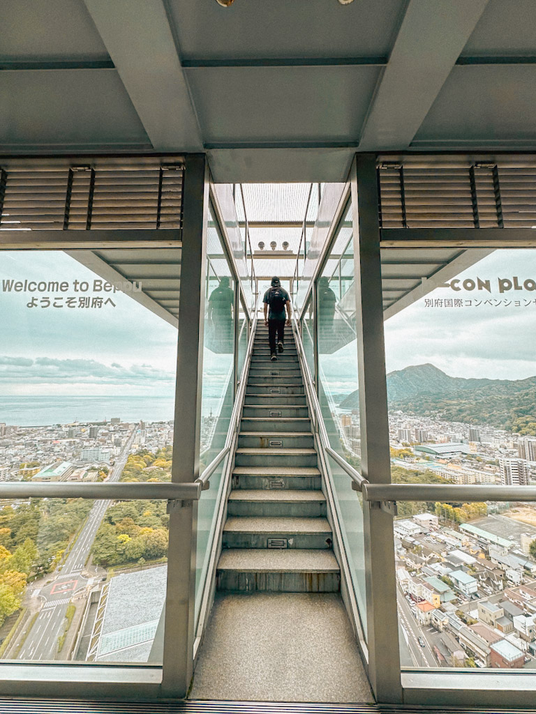 Sobald du den Beppu-Park fertig erkundet hast, kannst du zum Beppu Global Tower, der nicht weit vom Park liegt, gehen. Von der Aussichtsplattform hast du einen herrlichen 360°-Blick auf die Stadt, das Meer und die umliegenden Berge.