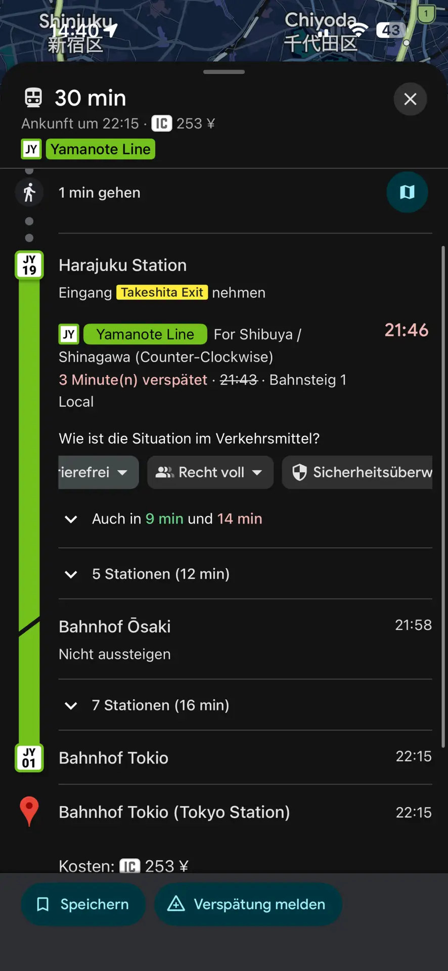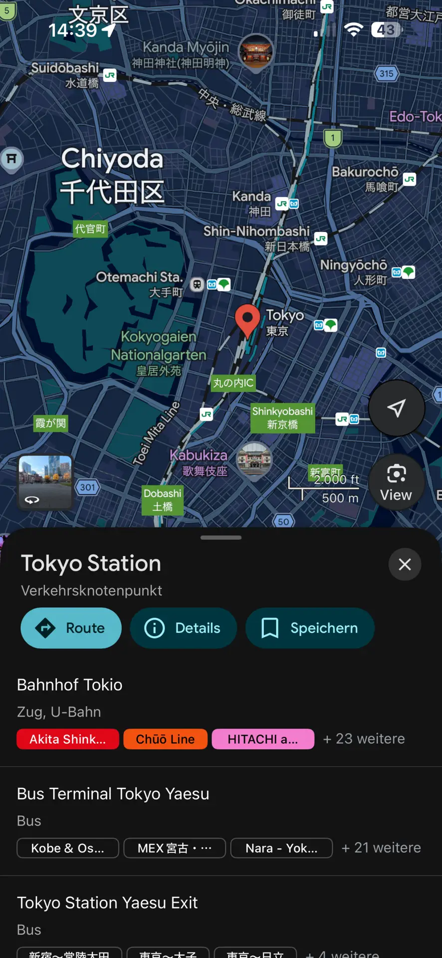 Gerade an großen Bahnhöfen wie Tokyo Station oder Shinjuku Station hilft Google Maps enorm dabei, den richtigen Ausgang oder Bahnsteig zu finden. Auch Restaurants, Cafés, Konbini und Sehenswürdigkeiten lassen sich schnell damit entdecken.