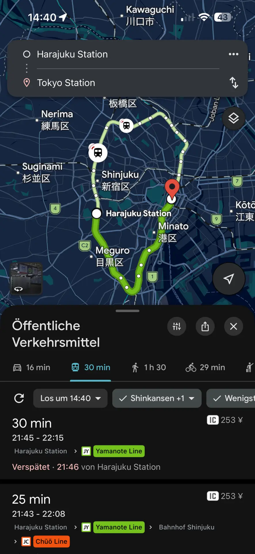 Google Maps ist wohl eine der wichtigsten Apps überhaupt, um in Japan stressfrei zu navigieren. Im Vergleich zu manch anderen Ländern funktioniert die ÖPNV-Navigation erstaunlich präzise. Die App zeigt dir Zugverbindungen, Umstiege, Fahrzeiten, Preise und sogar die richtigen Bahnsteige an – was besonders in riesigen Städten wie Tōkyō oder Ōsaka ein echter Segen ist.