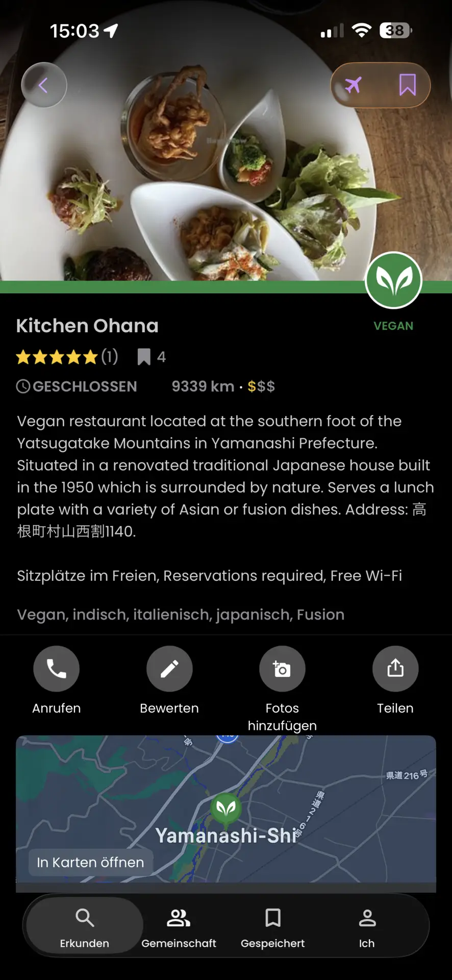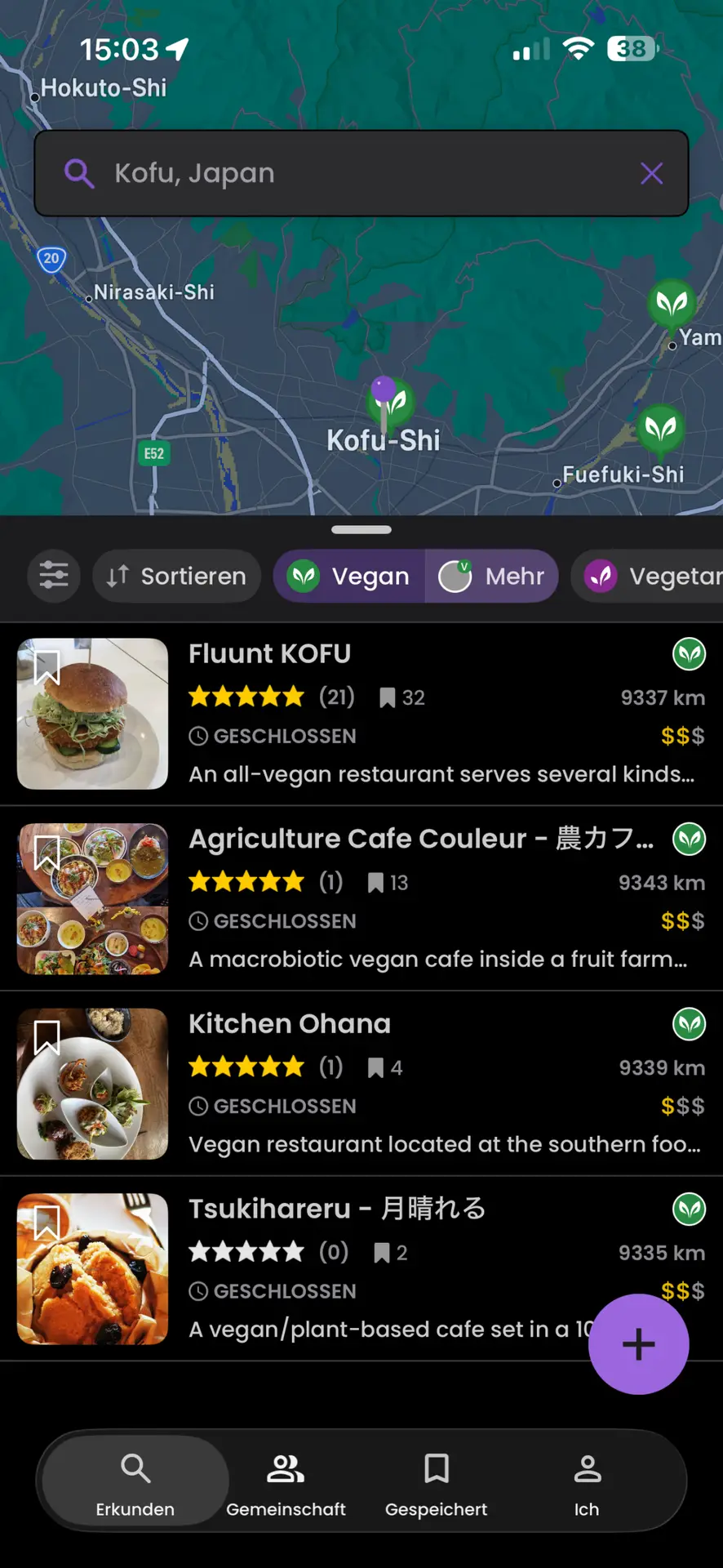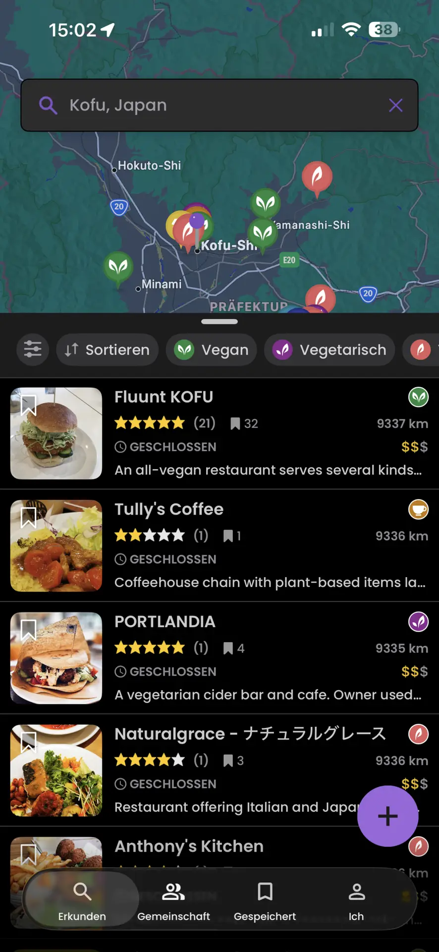 Für Vegetarier und Veganer kann Essen in Japan manchmal komplizierter sein als erwartet, da viele Gerichte Fischbrühe (Dashi) enthalten – auch solche, die auf den ersten Blick rein pflanzlich wirken. HappyCow hilft dir dabei, vegane und vegetarische Restaurants in deiner Nähe zu finden, und deutet dabei klar an, ob ein Lokal rein vegan ist oder nur vegane Optionen auf der Karte hat.