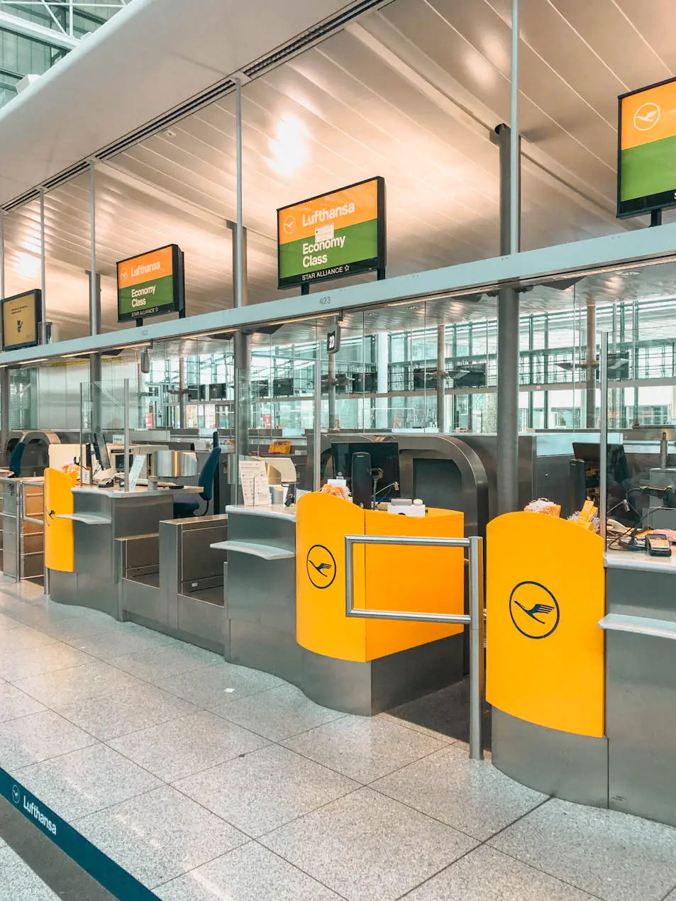 Sei 2–3 Stunden vor Abflug am Flughafen und begib dich zum Schalter deiner Fluggesellschaft oder nutze die Automaten, um dein Gepäck aufzugeben und deine Bordkarte zu erhalten.