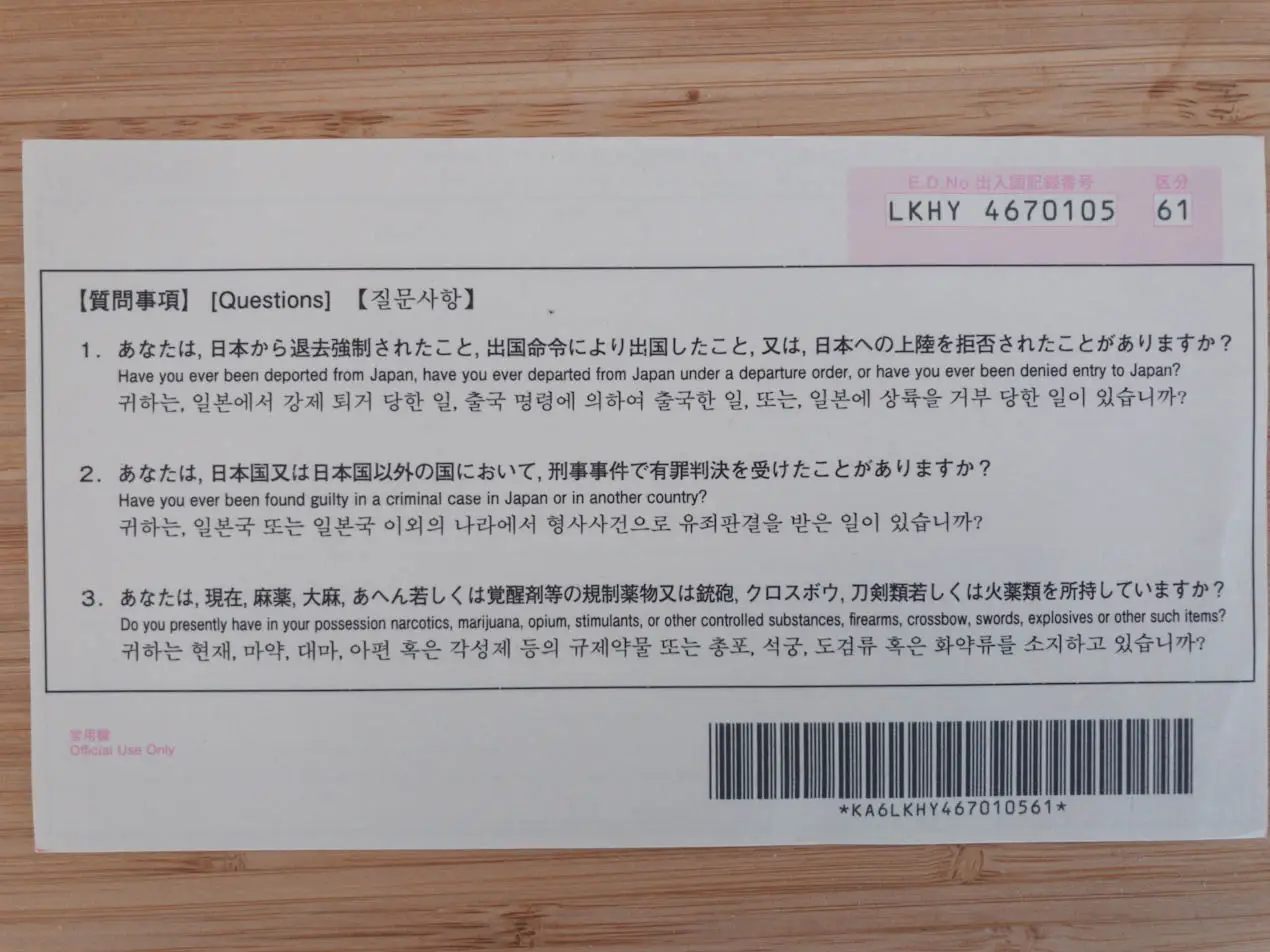 Ab der Passkontrolle verlässt du Japan nun offiziell. Lege dem Beamten deinen Reisepass und deine Zairyu-Karte vor. Sage dem Beamten, dass du das Land endgültig verlässt. Er wird dann deinen Aufenthalt offiziell im System abmelden. Möchtest du die Karte behalten, solltest du das dem Beamten mitteilen. Die Karte wird dann gelocht und damit entwertet, und du kannst sie mit nach Hause nehmen.