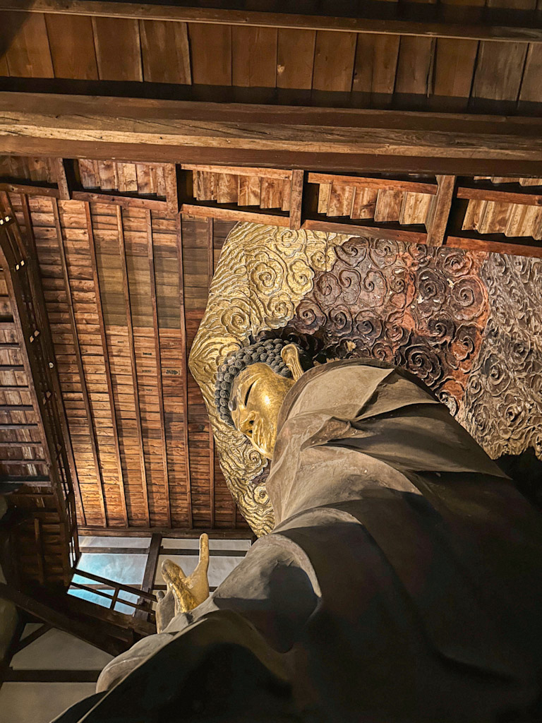 Mit einer Höhe von ca. 13,7 Metern gehört sie zu einer der größten Buddha-Statuen Japans. Was diese Statue aber so besonders macht, ist die Technik, mit der sie gebaut wurde: Die Statue besteht aus einem Gerüst aus Bambus und Lehm, das dann mit mehreren Schichten Papier, Lack und Blattgold überzogen wurde.