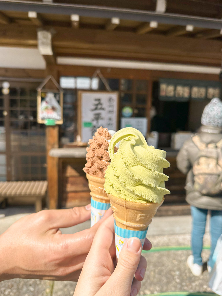 - Yukinko: Das Yukinko ist ein gemütlicher Laden, der perfekt zu einem Besuch im historischen Dorf passt. Besonders beliebt bei Yukino sind die Snacks: Dangos und Gohei-Mochi. Leider gibt es keine Möglichkeit, sich dort hinzusetzen, also ist es möglich, nur die leckeren Snacks im Stehen zu genießen. Ich habe mich schlussendlich für ein Matcha-Softeis entschieden, da die Sonne sich gezeigt hat und es sehr warm wurde.