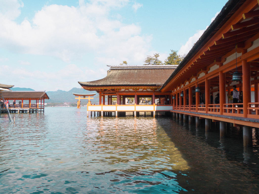 Der Schrein ist vor allem für sein ikonisches „schwebendes“ Torii-Tor bekannt. Beide sind einzigartige Bauwerke in Japan, da sie über dem Wasser gebaut wurden und bei Flut im Meer zu schweben scheinen.
