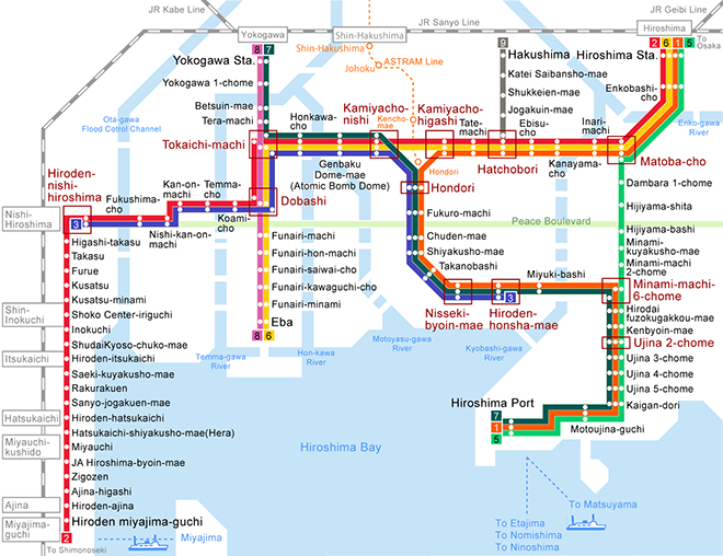 - Nr. 2 Honsen, Miyajima (Rot): Bahnhof Hiroshima – Hatchōbori – Kamiyachō – Tōkaichimachi – Hiroden Nishi-Hiroshima (Koi) – Hiroden Miyajima-guchi