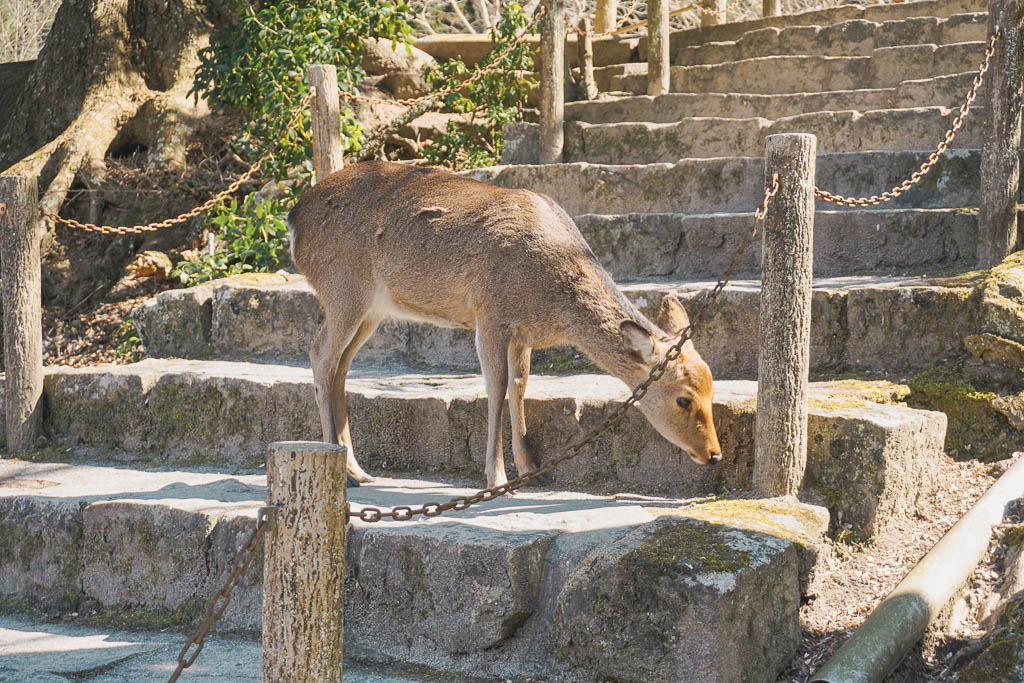 Ein weiteres Highlight der Insel sind die Hirsche dort. Sie sind zwar nicht so zutraulich wie die Hirsche in Nara, aber dennoch nicht ganz so scheu, wie du vielleicht denkst. Ganz viele Hirsche siehst du im Omoto Park, der etwas außerhalb liegt und im Frühling ein großartiger Platz ist, um die Kirschblüten zu betrachten.