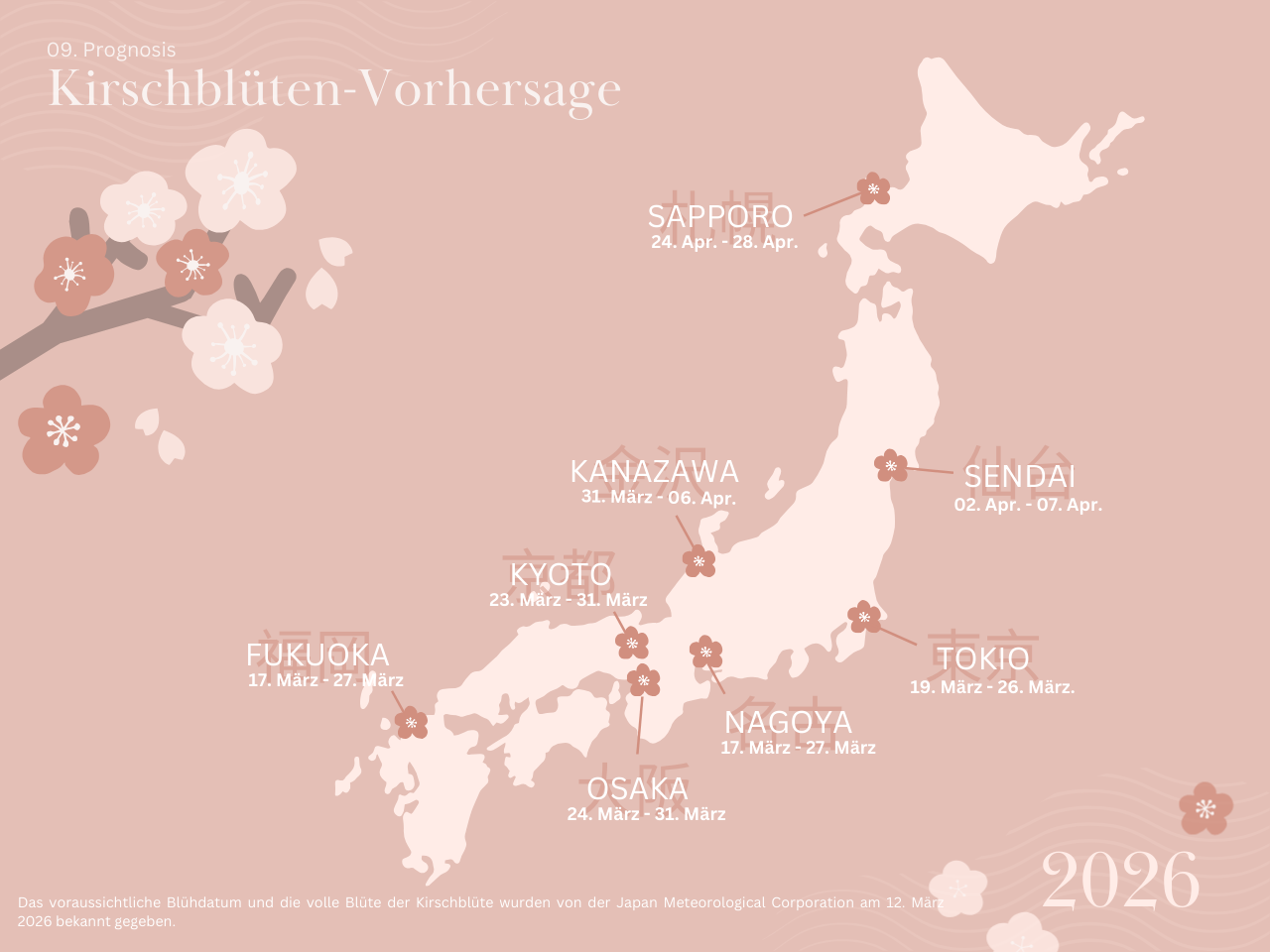 Die Kirschblüten Vorhersage gibt an, wann und wo die Kirschbäume voraussichtlich blühen werden. Die neunte Prognose wurde am 19. März veröffentlicht. In der Präfektur Kochi haben nun offiziell die Kirschblüten angefangen, zu blühen. Auch in Tokyo und Nagoya blühen die Kirschblüten. Die nächste Aktualisierung ist am 26. März.