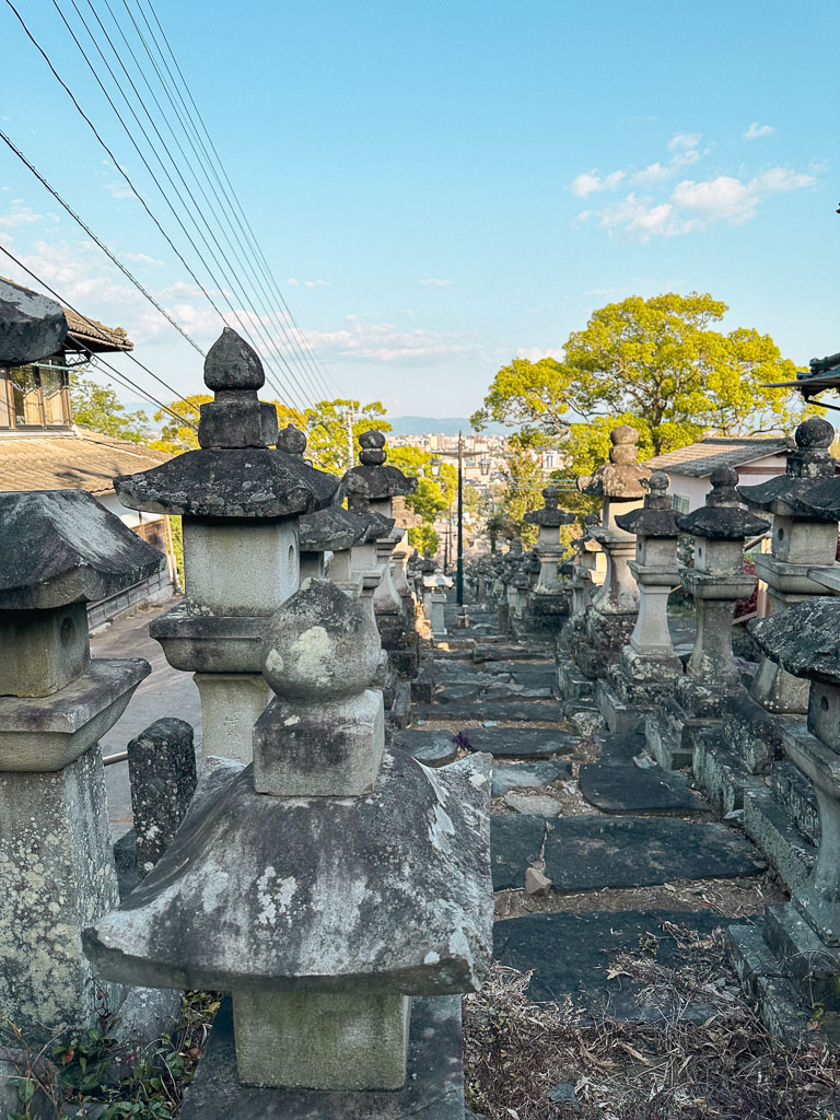 Das Highlight des Tempels ist der wunderschöne lange Steinweg, der zu ihm führt. Am Anfang der Straße zum Tempel beginnt der Weg mit einer schönen Allee von Kirschbäumen, die dann zu Stufen übergeht und dort mit über vierhundert Steinlaternen gesäumt ist.