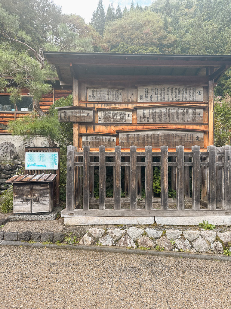 Zur Edo-Zeit wurden Verkündungen und Beschlüsse des Shogunats auf das Anschlagbrett gepinnt. Das Anschlagbrett weist deutliche Gebrauchsspuren und ist mittlerweile stark verblasst, dennoch kann man immer noch Dekrete und Proklamationen auf Japanisch von damals sehen.