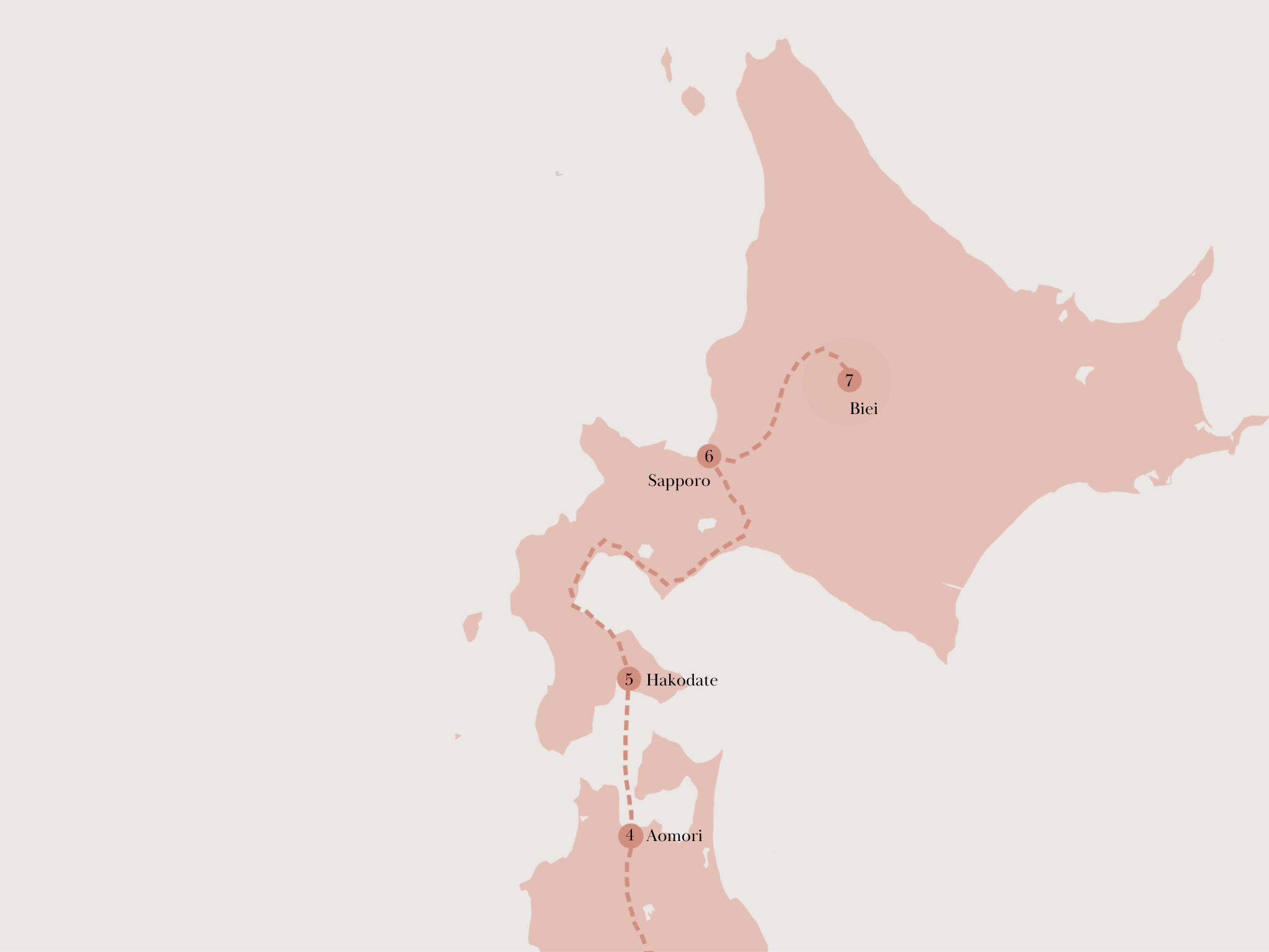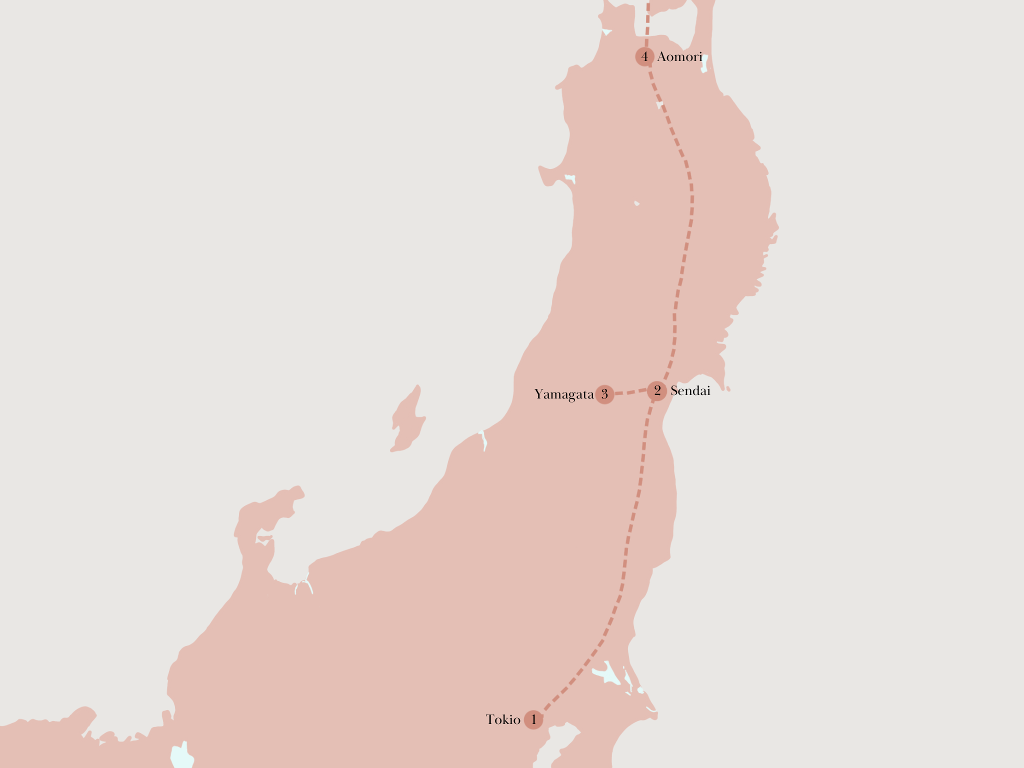 Der Start der Reise beginnt in Tokio, führt durch die Tohoku-Region (Sendai, Yamagata und Aomori) und endet im hohen Norden Japans in Hokkaido (Hakodate, Sapporo, Asahikawa und Biei).