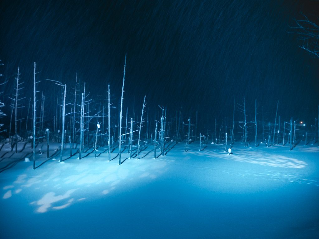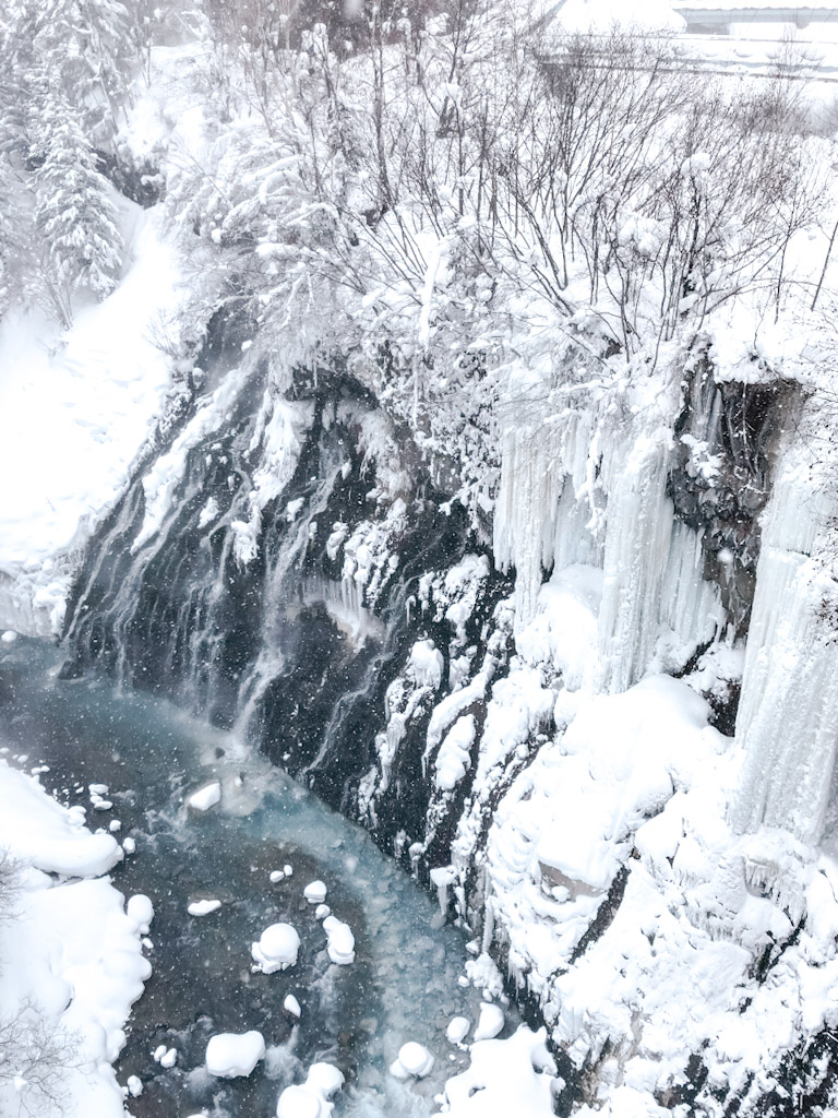 Ein besonderes Highlight ist der Shirogane Blue Pond, dessen leuchtend blaues Wasser im Kontrast zum Schnee ein atemberaubendes Naturschauspiel bietet. Ganz in der Nähe findest du auch die Shirahige-Wasserfälle, die im Winter von Eiszapfen umrahmt sind.